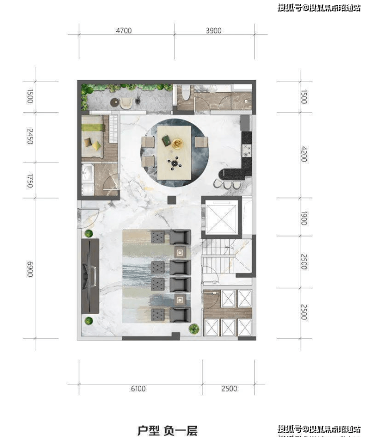 负一层:地面花园和地下车库双入户设计,娱乐/影音室布局,私密性较好;