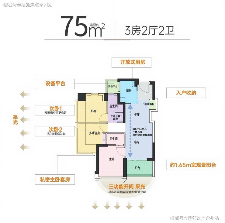 75㎡三房两厅两卫(竖厅):LDKB 一体化设计(客厅 + 餐厅 + 厨房 + 阳台),S 型墙体预留 60cm 冰箱位,减少空间浪费。