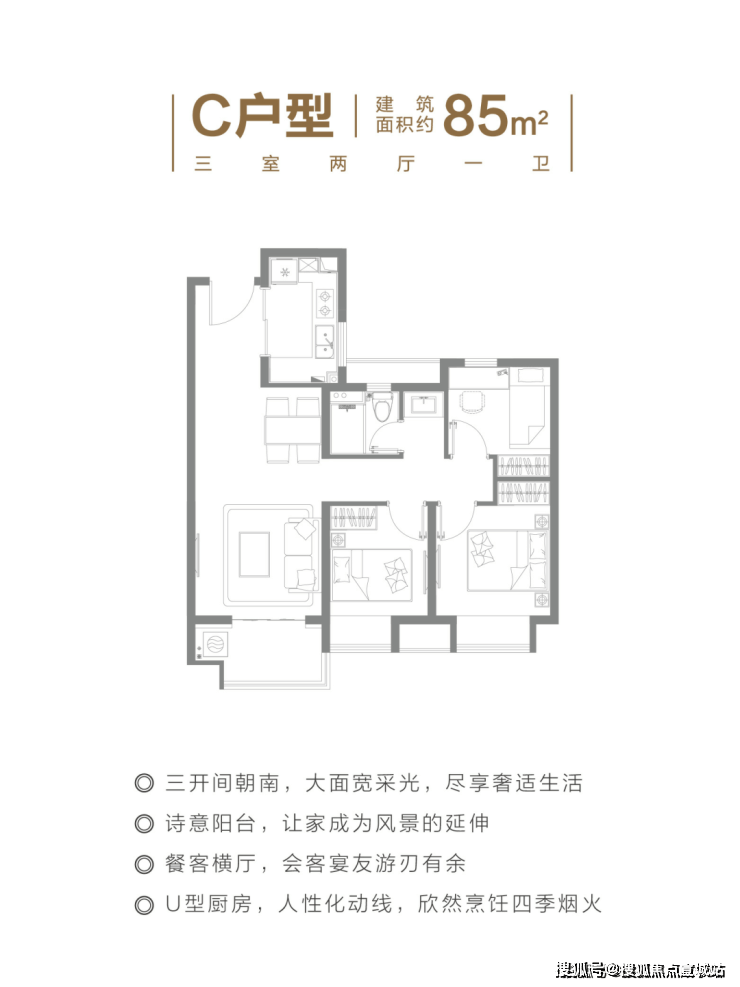 建面约85㎡的3房2厅1卫,低总价强功能三房,三开间朝南+整体动静分离的设计,都保证了这个户型的居住舒适度。