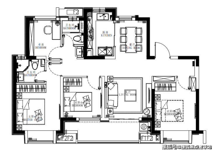 85-95㎡三房:双卫设计,L型厨房联动餐厅,提升家庭互动效率(参考同类型户型设计)。