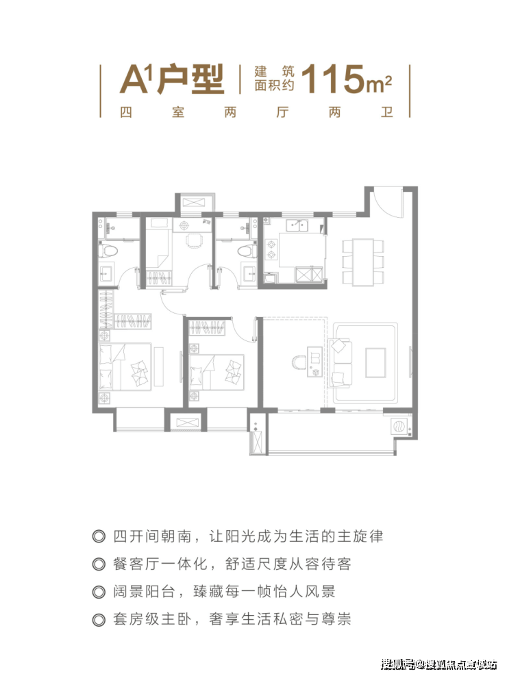 本批次新加推的建面约123㎡的4房2厅2卫户型,则是115户型的进阶版。同样四开间朝南,餐客厅一体化设计,真正的南北通透,尺度感和舒适度更高。