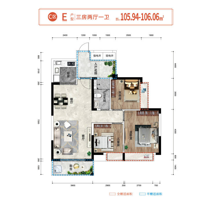 🏖E户型约105.94㎡(三房两厅一卫)