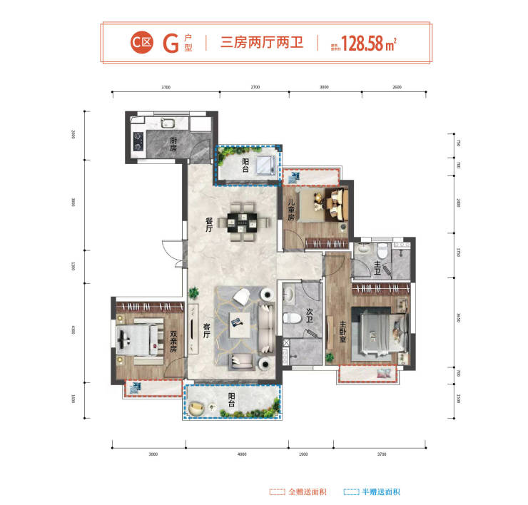 🏖G户型约128.58㎡(三房两厅两卫)
