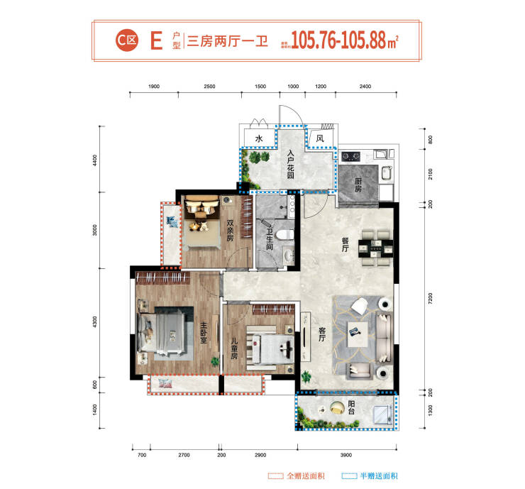 🏖E户型约105.76㎡(三房两厅一卫)