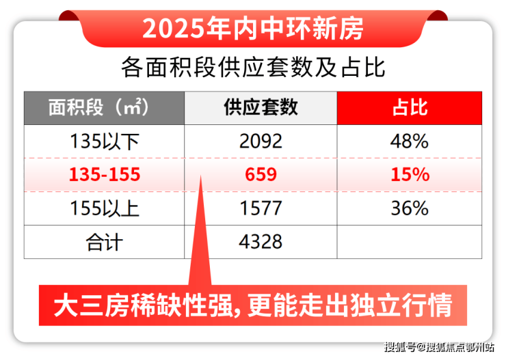 对比市场:百平米或120㎡左右三房空间紧凑,难满足舒适需求;155㎡以上四房总价偏高。该面积段大三房既能保证空间宽敞,又能控制总价,稀缺性显著。