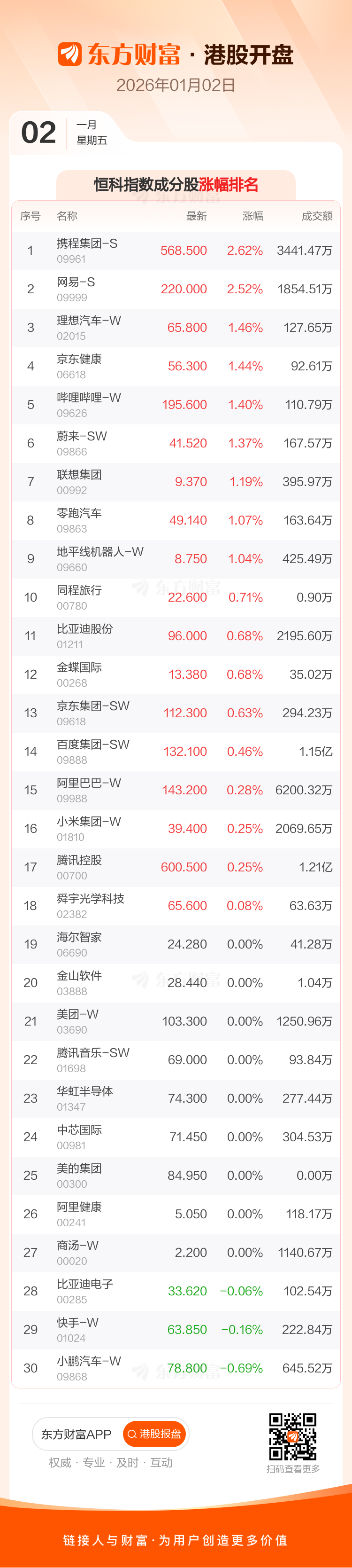 港股1月2日高开,恒生指数开盘报25717.42点,涨86.88点,涨幅0.34%;恒生科技指数开盘报5547.85点,涨31.87点,涨幅0.58%。恒生指数成分股中携程集团-S网易-S友邦保险涨幅居前,华润万象生活恒安国际药明生物跌幅靠前。恒生科技指数成分股中携程集团-S网易-S理想汽车-W涨幅居前,小鹏汽车-W快手-W比亚迪电子跌幅靠前。