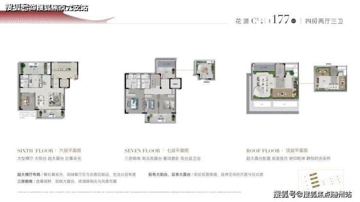 上叠C3户型“花源”建面约177㎡,正如名字一般,四季如花盛绽:一层南向约5.6米大阳台,北向超6米大进深露台;二层南向约5.6米大阳台,北向约3.65米大进深露台;顶层奢配近100平米超大露台,三重露台格局,赋予空间不同层次感的景观奢享体验,大手笔珍贵难觅。
