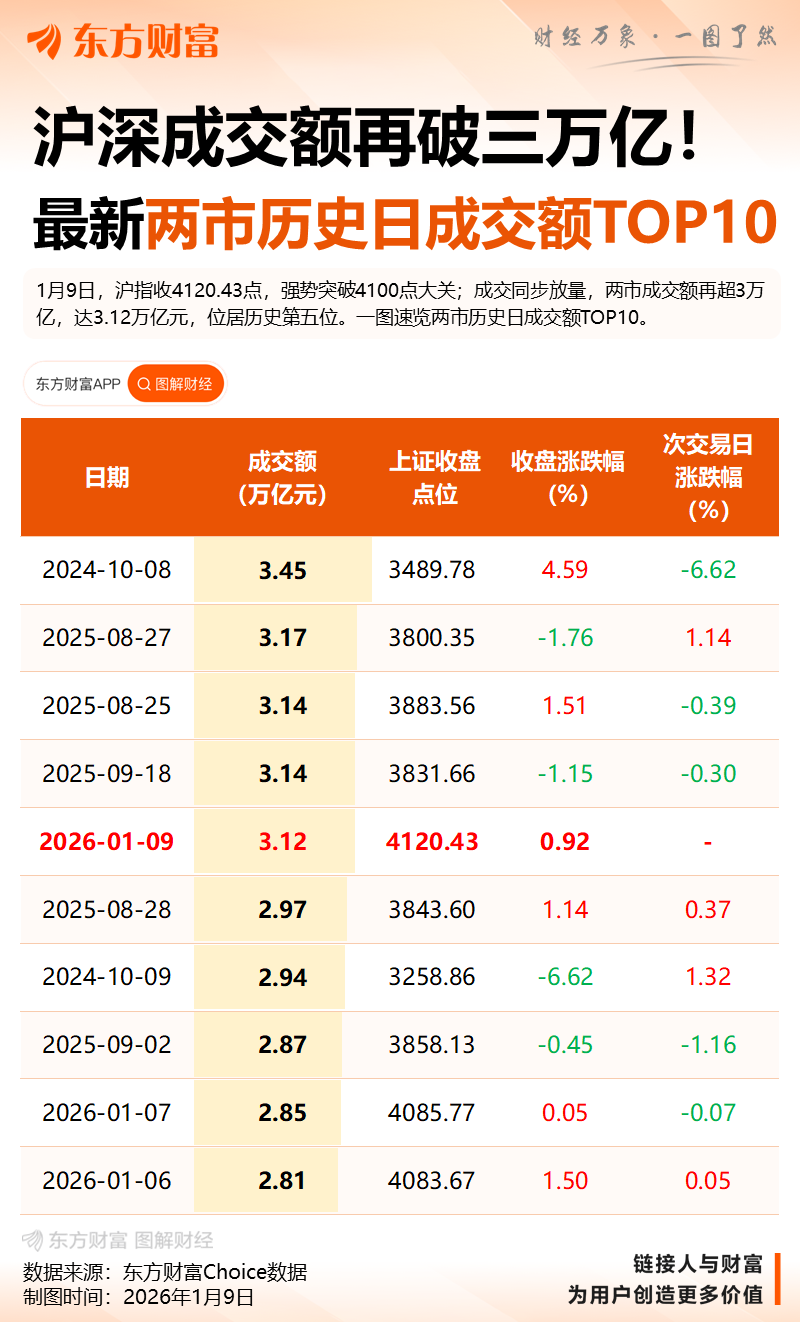 全市场超3900只个股上涨,连续2日超百股涨停。沪深两市成交额3.12万亿元,较上一个交易日放量3224亿,历史第五次突破3万亿。