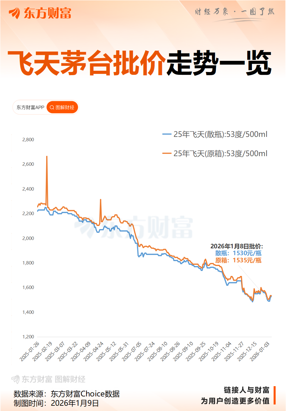 “今日酒价”披露的批发参考价显示,1月9日,25年飞天茅台(原)较前一日上涨10元,报1545元/瓶;25年飞天茅台(散)较前一日也上涨了10元,报1540元/瓶;公斤茅台(原)较前一日上涨50元,报3050元/瓶。