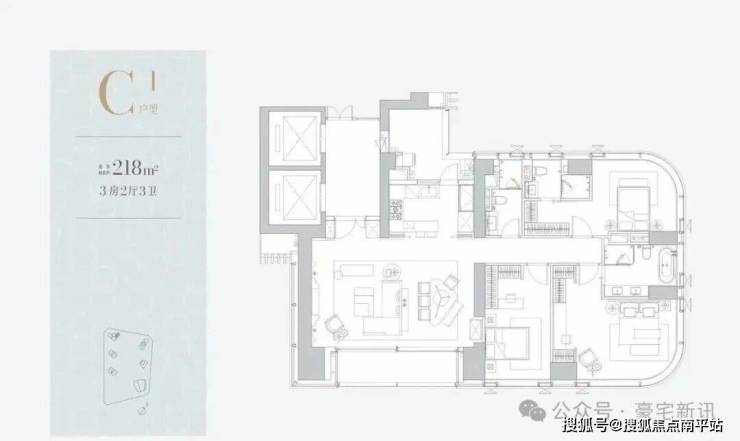 1C栋(1栋三单元)-51层:4梯3户,约210㎡,为一期的入门级户型,一层三户。
