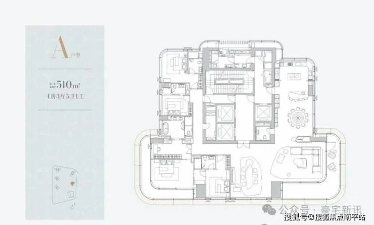 1A栋(1栋一单元)-43层:3梯1户,约510㎡,一层一户,私密性极致,为项目旗舰户型。
