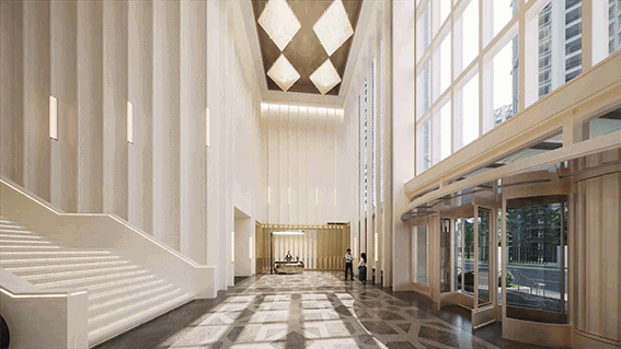从海派入户旋转门推门而入,第一眼便能看到约13-15米的挑高大堂,艺术阶梯其作为艺术展示的重要空间,最大程度引入自然光,为空间打上朦胧、柔和的光感,融合左右两边的弧形柱体,犹如登山之“径”,随着脚步一步步叠加行进的趣味,沉浸的归家体验感随空间变化逐渐递增。