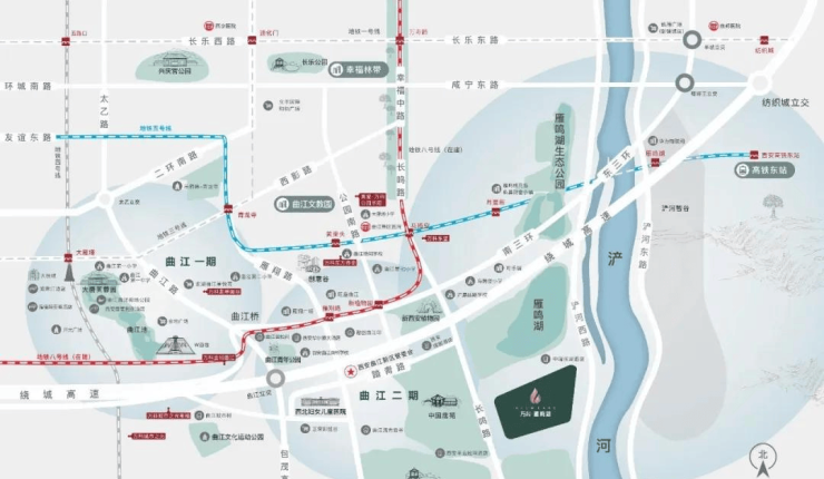 两纵:浐河西路、长鸣路;两横:南三环、绕城高速,无忧自驾出行;项目西侧杜陵邑南路已经开通,从雁鸣湖到曲江管委会约 2.2 公里,便捷通达曲江核心。