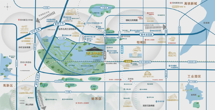 项目位于相城、姑苏、新区三区交汇的黄金位置,配套成熟,生活便利。 最大的亮点是,它与约873公顷的虎丘湿地公园零距离,相当于把整个湿地当成了自家的后花园。这种被超大天然绿肺环抱的岛居生活环境,在苏州主城几乎绝版。