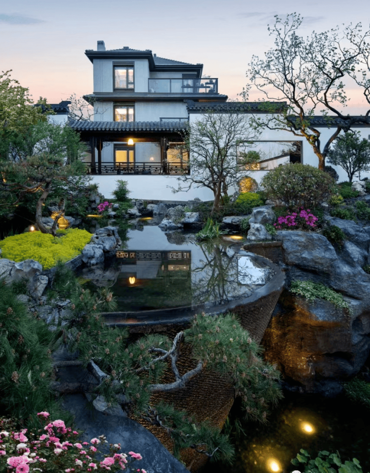 园林设计以中国皇家园林御苑作为景观设计根基,参考苏州拙政园设计蓝本。