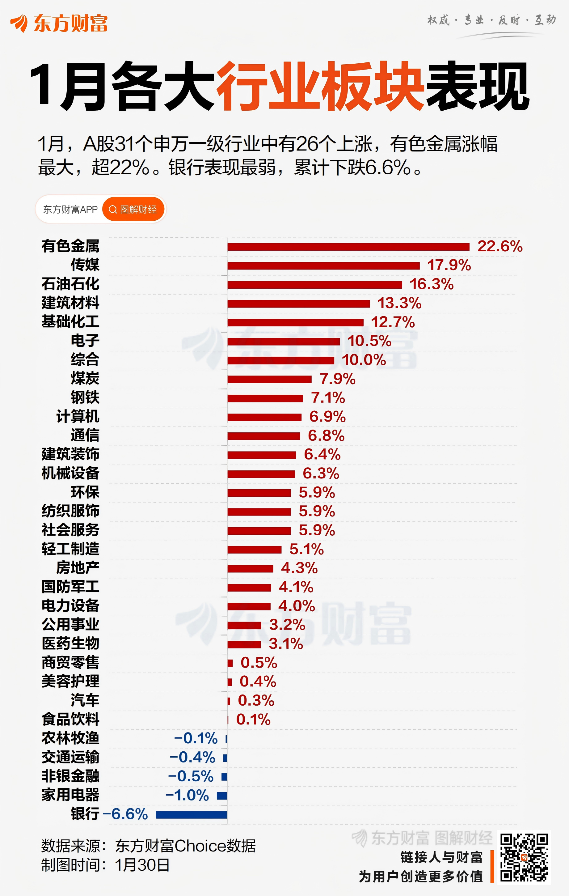 行业板块方面,1月,31个申万一级行业中有26个上涨,占比超八成。其中,有色金属涨幅最大,当月上涨22.6%,也是唯一涨超20%的行业;传媒、石油石化、建筑材料、基础化工、电子、综合等涨幅居前,均超10%。