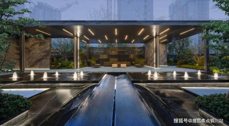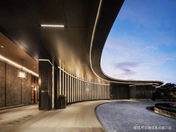 中海·江湾樾自门头始,即采用全名贵石材加金属铝板设计,并以香槟金色铝板通过不同的造型,塑造蜿蜒檐部,方形与三角形的格栅细节,更突出了金属细节收边工艺。