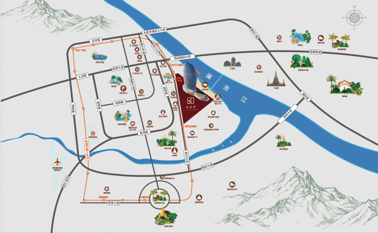 •项目介绍: 项目地处西双版纳最核心版纳泼水广场旁,拥有一线江景,与告庄对望。周边拥有大润发、沃尔玛、江边夜市、白象沙滩以及高尔夫球场等众多成熟商业配套。未来规划轨道交通从项目穿江而过直达告庄。 项目自身规划5.6万方轻奢商业,2.5万方城市广场,以及超星级地标酒店,项目致力于开发为版纳标杆豪宅产品。