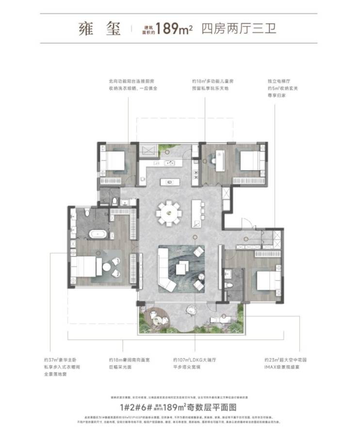 :区域惟此四代宅低密洋房住区,建面约 165m² 峯境岛院 / 建面约 189m² 隐奢洋房,超高得房率,LDKG 无界大端厅,颠覆级改善体验