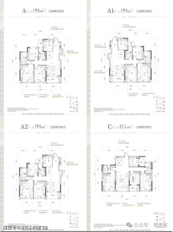 户型设计:建面约99㎡的三房两卫户型,动静分区,采用三开间朝南设计。建面约113㎡的三房两厅两卫户型,四开间朝南,拥有封闭式阳台,南向采光充足,使得整体空间更加宽敞明亮。棠悦芳华轩建面约139㎡生活美学馆
