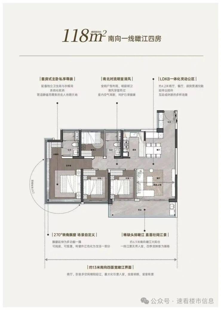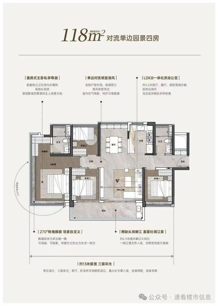 2) 户内私享约 20 ⽶五⾯观江界⾯,约 30 ㎡主卧 270°瞰江。