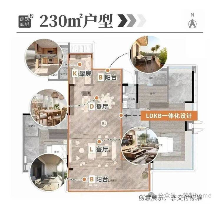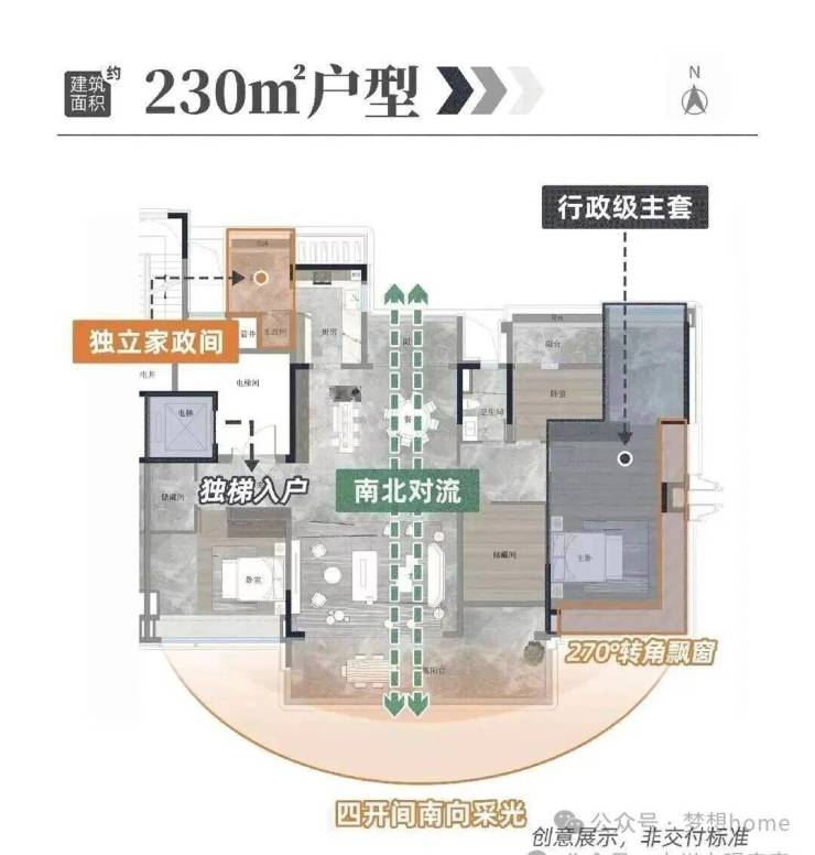 230平户型拥有私家电梯厅、双主套、独立佣人房、南北对流、LDKB大方厅、主卧L型270°飘窗等,大大提升了整体的空间体验。