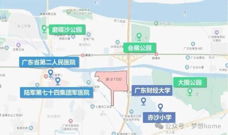 越秀琶洲南TOD项目位广东省广州市海珠区金运路1号,海珠赤沙TOD地块东侧紧挨华南快速干线,北侧隔着黄埔涌,对岸就是高楼林立的电商总部琶洲西区。