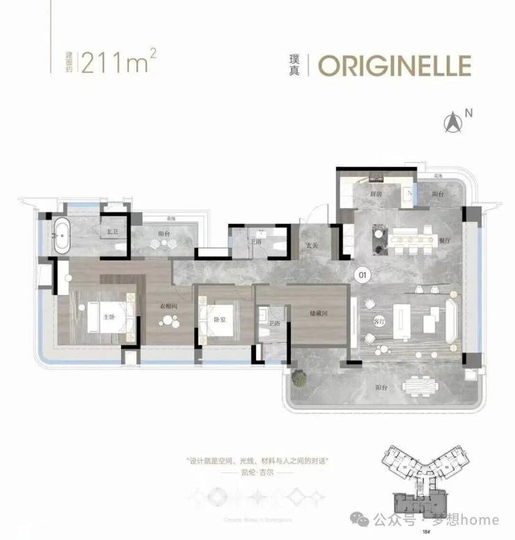 休憩区、步入式衣柜、多功能区、L型大飘窗等场景都有规划,居住尺度完全是按照豪宅的做法,仪式感和实用性满分。