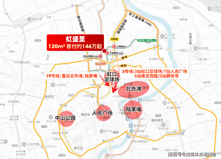 三轨交环绕形成高效通勤网——直线距离3号线江湾镇站约500米,3站虹口足球场/7站人民广场/8站南京西路/9站静安寺;直线距离20号线万安路站约150米(在建)/直线距离南北大动脉19号线车站南路站约900米(在建),未来可直达北外滩、陆家嘴。
