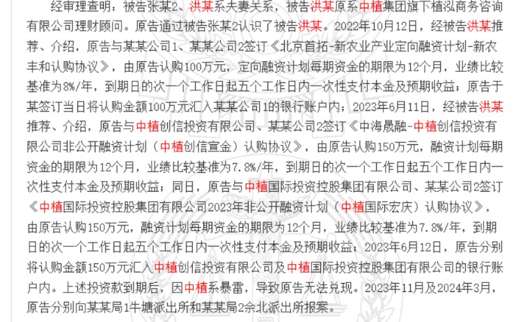 对此,张某和洪某辩称,本案涉案款项系原告投资款,实际接收方为中植集团,洪某仅为中植集团旗下公司销售员,向原告宣传某某集团理财产品系正常履职行为。