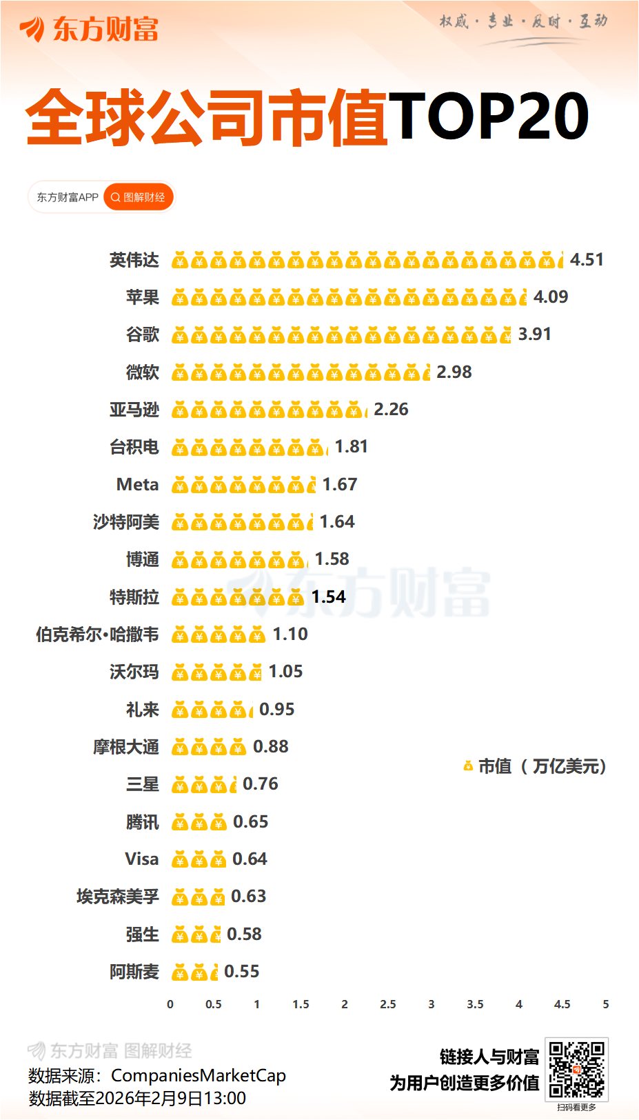100万亿美元究竟是什么概念?目前全球市值最高的十家公司——英伟达、苹果、谷歌母公司Alphabet、微软、亚马逊、台积电、Meta、沙特阿美、博通、特斯拉——当前总市值约为26万亿美元。
