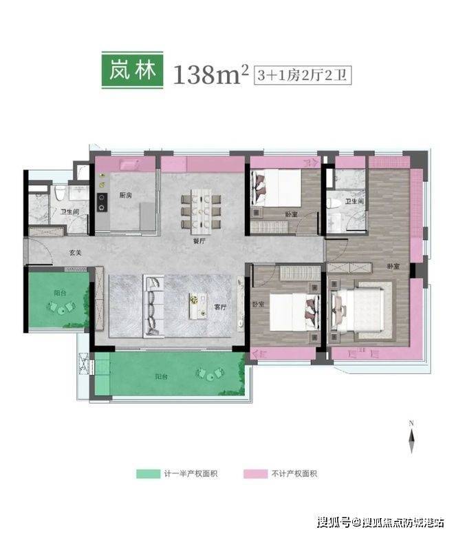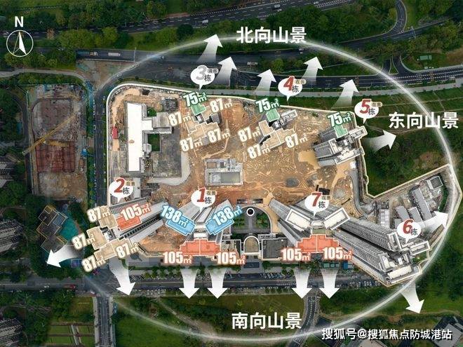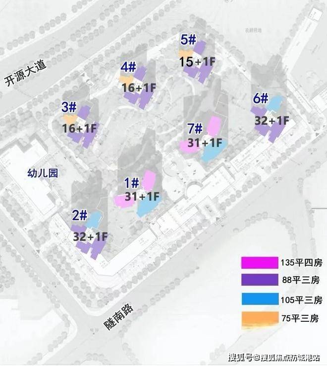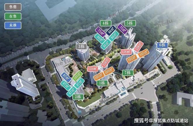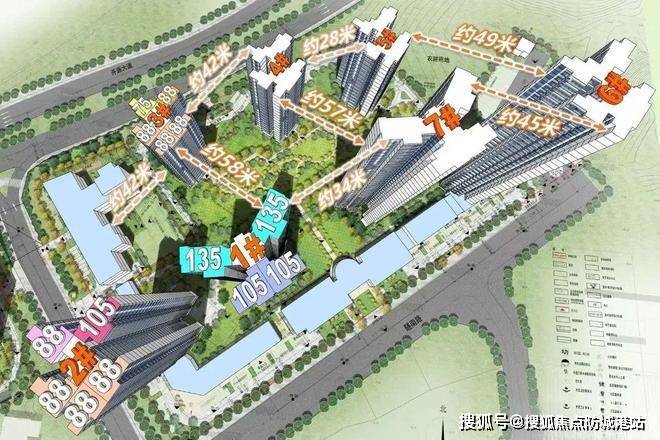 户型设计亮点十足。整个项目 7 栋商品住宅,前排 4 栋 32 – 33 层,后排 3 栋 16 – 17 层,3 – 4 – 5 – 6 栋为 2 梯 5 户,1 – 7 两栋为楼王,2 梯 4 户。前后两排布局优势明显,散点式排布提高单边位采光和视距,增加单边位货量;前后平行排布形成通透式中心园林,拉大楼栋间距。