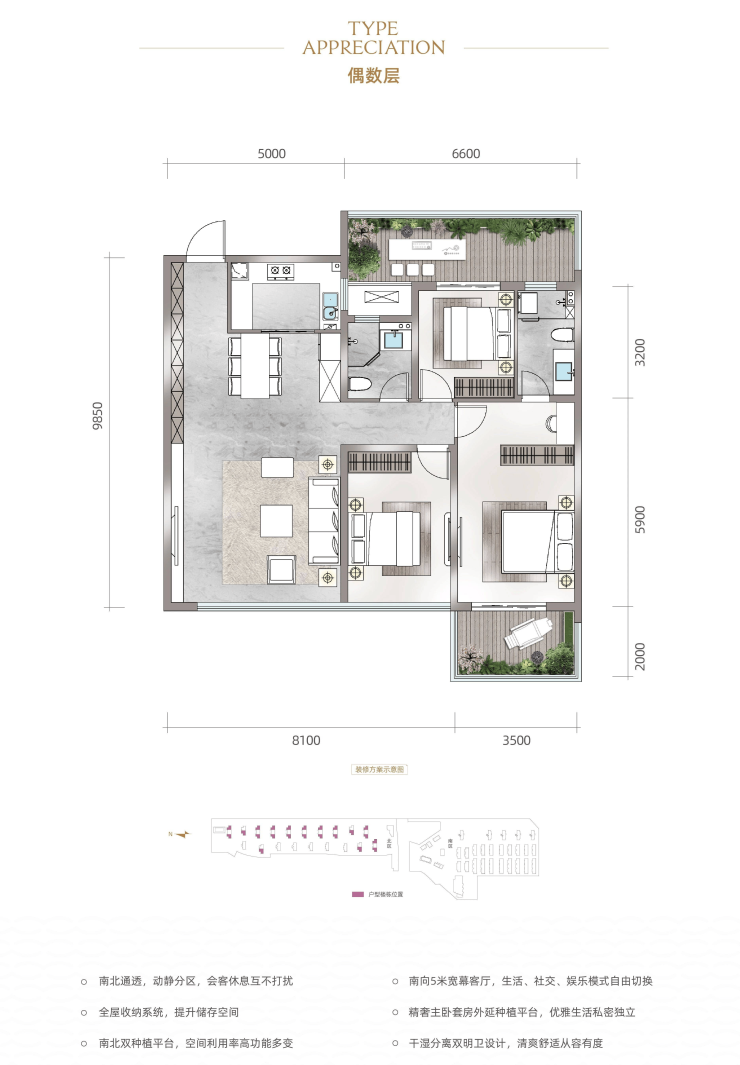 私享山水归家花园,礼仪之门彰显威仪气势。北区园林以阿房图景“宴游之趣”为背景设计,打造8大宴游聚场,将千年诗意栖居之所,尊崇优雅呈现。