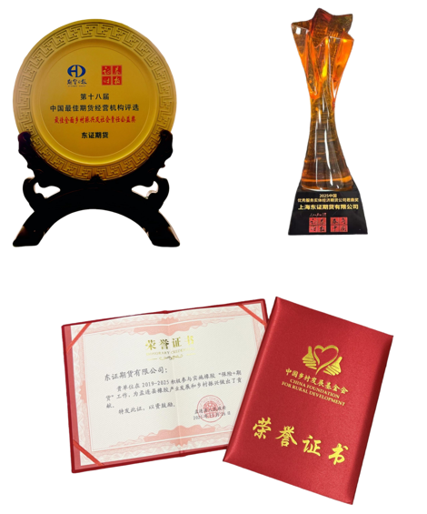 过去一年里,东证期货始终认真贯彻落实党中央关于乡村振兴工作的重要部署,坚决扛起乡村振兴政治责任,全面提升服务实体经济的能力与担当,斩获第十八届“最佳乡村振兴服务及社会责任公益奖”和“2025年度中国优秀服务实体经济期货公司君鼎奖”;讲好乡村振兴故事,发布多篇乡村振兴新闻宣传稿,其中孟连县天然橡胶“保险+期货”报道阅读量超85万,开展的工作收到了来自兰考县等乡村振兴地区的感谢信、荣誉证书及锦旗等。