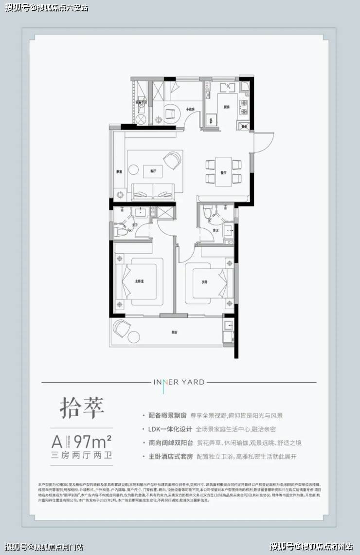 建面约97㎡三室两厅两卫户型都是边套,三面采光,还有很难得的6.4米南向双阳台,3.9米的景观大飘窗,类似的尺度市面上基本要120㎡的户型才能做到。