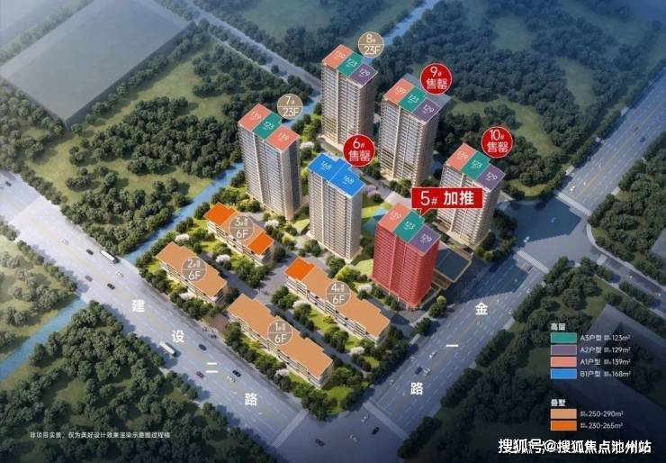 项目位于建设二路与金一路的交会处,依托方正的地形,规划了6幢高层+4幢叠排,其中高层住宅仅356套。户型方面,本次首开的2幢高层(9、10号楼),主推建面约123㎡的中间套,以及建面约129㎡、139㎡的边套,均为四房两厅两卫全明格局。