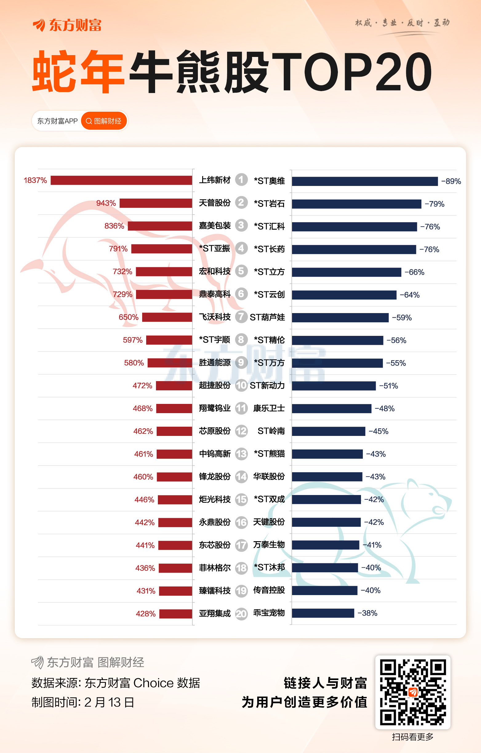 乙巳蛇年A股交易收官,“双春年”(一年两个立春)的祥瑞之兆得到印证,这一年成为近11个生肖年中表现最好的一年。截至2月13日收盘,上证指数全年涨25.58%,深证成指涨38.84%,创业板指涨58.73%。