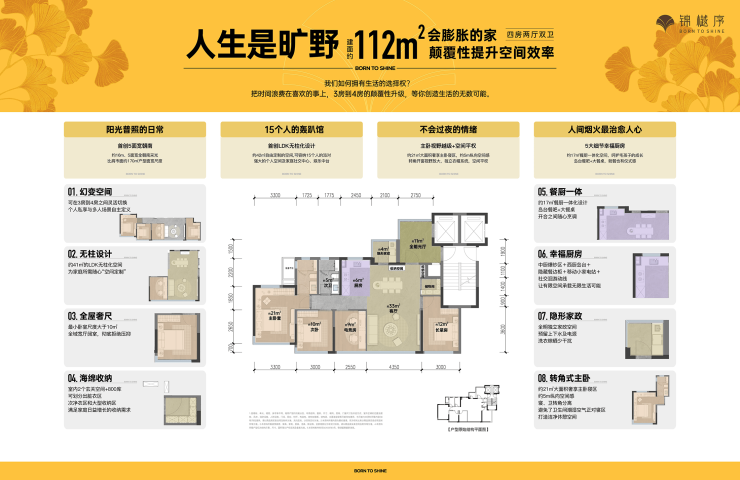 ✅ 建面112㎡小四房(首改首选):罕见五面朝南、无柱化客厅设计,37%可变空间可灵活切换3-4房,42㎡公区可容纳15人聚会,全屋预留超400L收纳空间,以小户型预算享受大户型质感,总价310-320万区间。