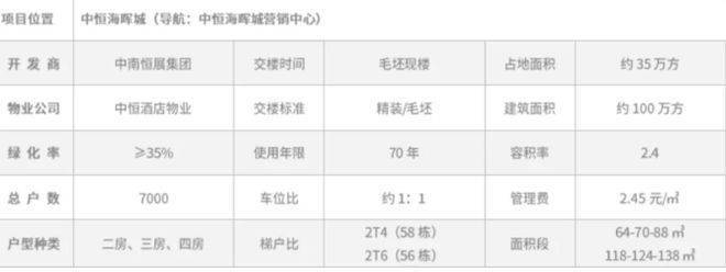 中恒海晖城由佛山市中南恒展房地产有限公司开发。项目总占地 35 万㎡,总建面 100 万㎡。目前在售 56、58 栋,交楼时间为现楼。绿地率≥35%,容积率 2.4,产品面积为 64 – 146㎡精奢户型,总户数 7000 + 户。物业为中恒酒店物业,具备国家一级物管资质,拥有 20 年丰富管理经验,物管费 2.45 元 /㎡/ 月。项目配建国际 IEC 双语幼儿园(已开学),西侧规划一所市政公办小学,一路之隔有南海信息技术学院(已开学),周边 3km 内涵盖南海高新区第一小学(公立已开学)、小塘小学 / 小塘中学(公办省一级,已开学),5km 内多所石门名校环绕。紧邻南海人民医院新院,自拥星级中恒酒店、成熟商业街区并规划打造约 20 万㎡高档大型商业综合体。内部拥有约 10 万㎡阔景园林,配套游泳池、乐活跑道、运动球场等均已投入使用。