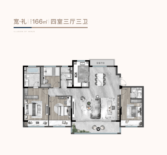 4个大卧室,各自有属于自己的私人空间均可独立使用,私密性很高,并且是双套房设计。在约166㎡的面积段里直接做到了双套房3卫功能性,这样的设计几乎要建面约180㎡以上才能做到。