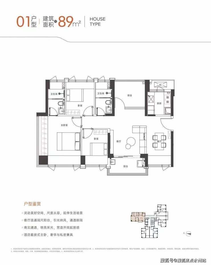 89㎡四房两厅两卫:横厅南北通透格局,四开间朝南,南北双阳台;北侧阳台可改书房/小卧室,空间灵活性高;主卧双飘窗,U型厨房,卫生间干湿分离;西南朝向,赠送后得房率约98%,仅约30套,稀缺性极高。