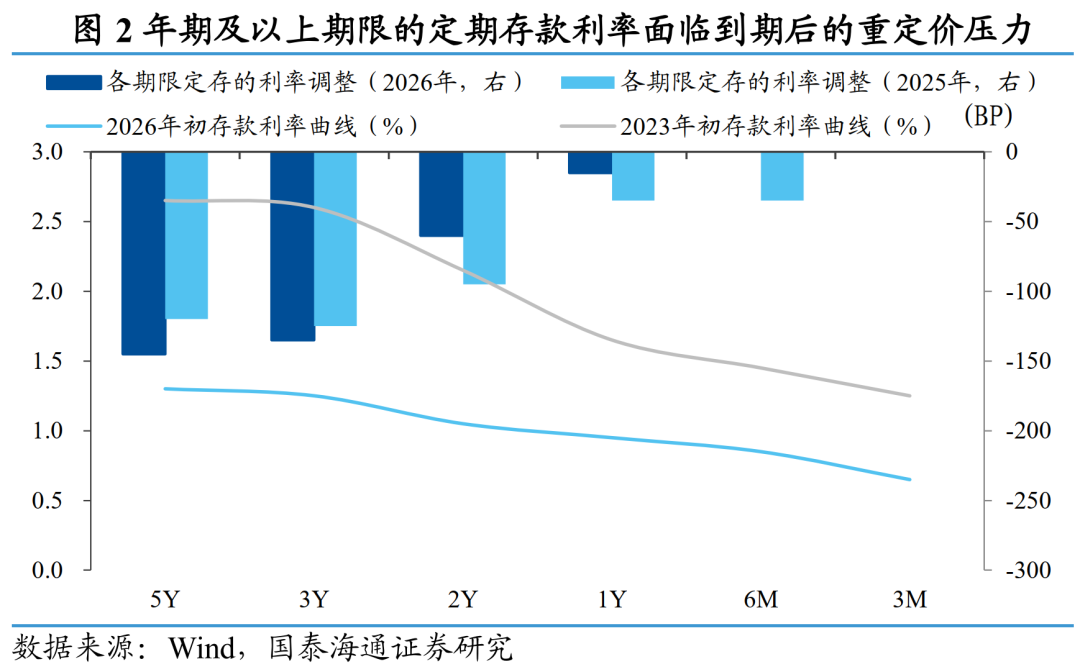 需要指出的是,类似的利率落差在2025年已然出现,2025年到期的2年期和3年期存款续作时同样面临约120bp左右的降幅。2026年的压力更多是边际加重,而非首次出现的激增。