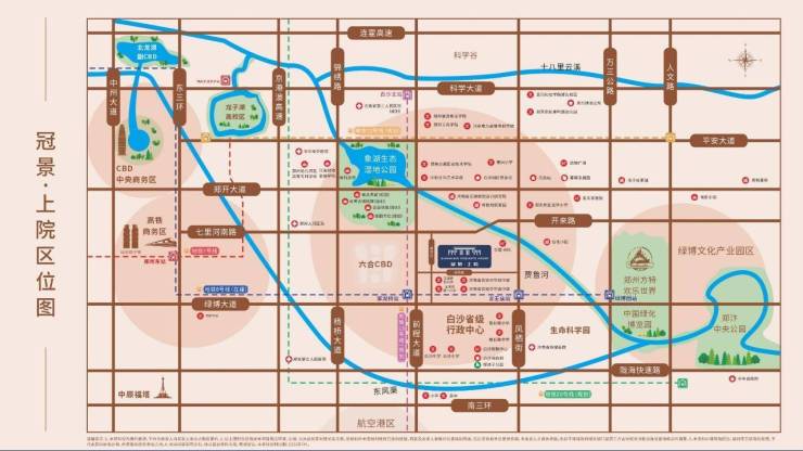 【生态环境】河湖公园 城市生态绿肺约5000亩象湖公园咫尺之距,2300年贾鲁河玉带环腰,约3000亩绿博园绿意葱茏,约27平方公里中央湿地公园、象湖南岸公园、象山公园相继动工,赋予生活更多自然之趣
