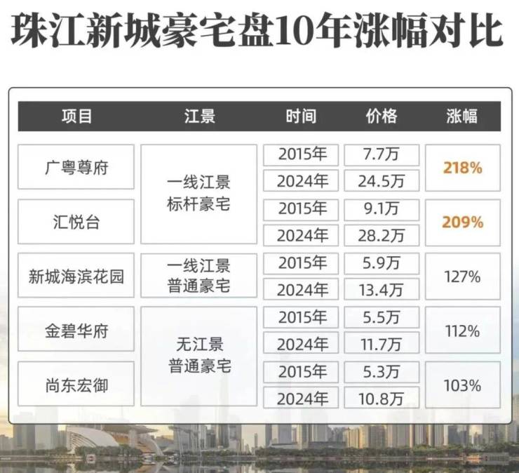 像同在珠江新城东区,占据一线江景的标杆顶豪盘,不仅总价更高,涨幅也远远甩开其它没有江景或者品质一般的豪宅盘。