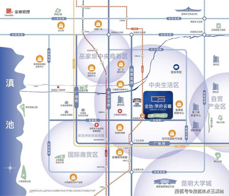 地处昆明自贸产业区、巫家坝片区、国际商贸区、昆明大学城四大板块交汇处,占据了昆明中央生活区核芯位置,区位、配套方面优势明显。