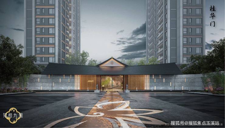 特色铺装折桂路延伸至中式贵气桂华门。金属瓦屋面的坡屋顶,搭配海蓝宝石材装贴,尽显高贵与典雅。