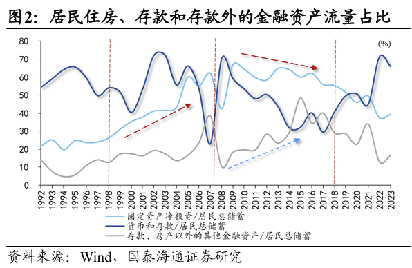 第二阶段(2008–2018年)表现为居民财富加速由存款向资管产品迁徙的时期。2008年后,资管行业快速发展,银行理财、信托及各类资管产品规模显著增长。从居民资金流量结构看,2008-2018年住房和存款占居民总储蓄的比重均下降,而存款外的金融资产占比呈上升态势。其中,其他金融资产流量占比加速上行,反映居民财富加速流向资管产品。
