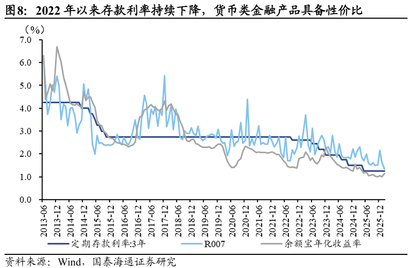 二是其他风险资产的相对收益改善。2024年以来,债券和权益市场阶段性回暖,投资回报提升,使股债资产相对存款更具吸引力。在存款利率下行的背景下,这种收益优势更为突出,从而推动部分资金从存款分流至货币基金、固收类产品及部分权益资产。