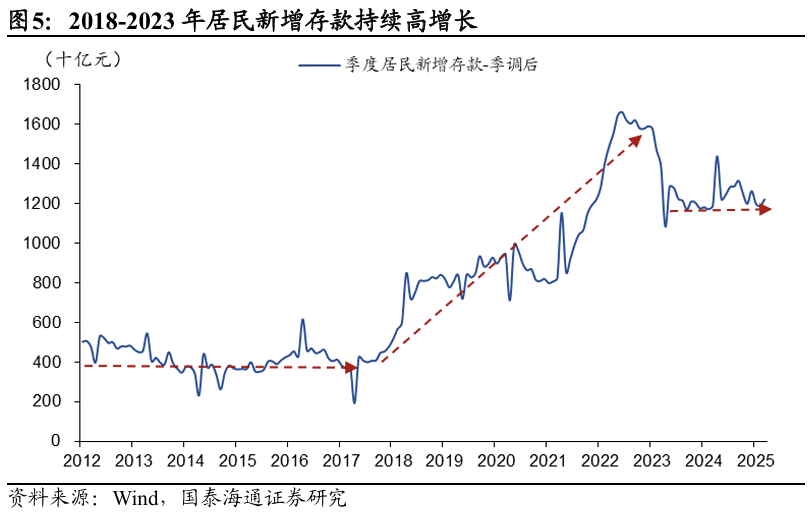 2018年是中国居民财富配置的第二个关键转折点,居民财富由房地产及相关金融资产回流至存款端,开启第二次历史性的大迁徙。2018–2023年,居民存款进入趋势性高增长阶段,年均新增存款约12万亿,显著高于此前每年4–5万亿的常态水平。这段时间里居民存款增速由落后转为领先于社融增速,并在2022年后维持在社融增速之上,说明居民存款高增并不能完全用整个实体的货币量变化来解释。更重要的原因在于:
