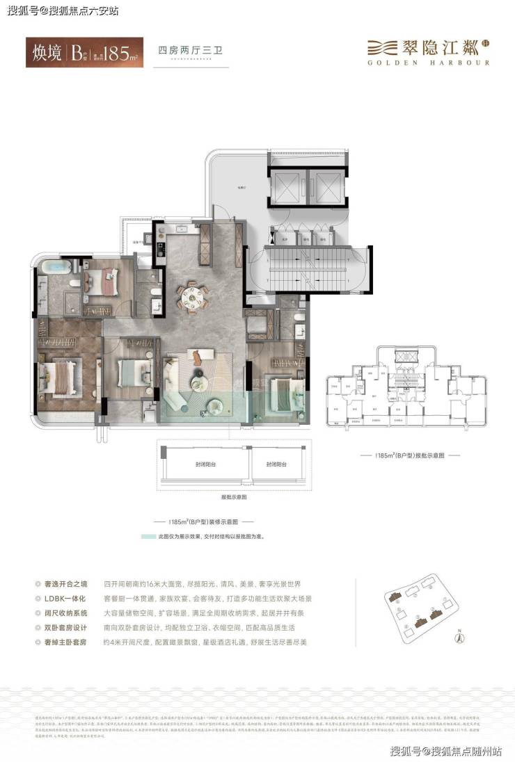 目前在售户型涵盖建面约161㎡、185㎡、230㎡四至五房,均为精装交付,装修标准对标国际水准,由知名设计师唐忠汉定制隐奢精装风格,选用东芝、高仪、博世等国际一线品牌,兼顾实用性与格调。其中161㎡户型采用双套房设计,185㎡户型拥有16米南向大面宽,230㎡户型作为终极改善户型,配备转角电梯明厅,满足三口之家、多代同堂等多元改善需求。项目备案均价约61307元/㎡,总价1000万起,预计2027年7月31日交房,由绿城物业服务集团有限公司提供服务,物业费7.3元/㎡/月,以高端物业服务标准守护业主日常。